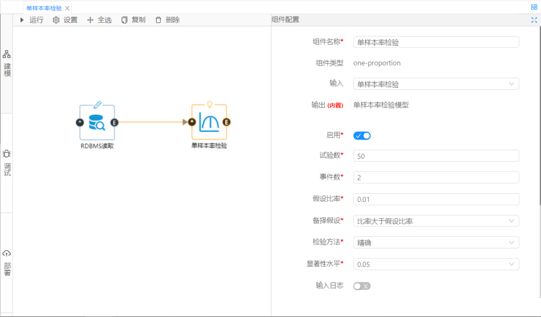 圖2 單樣本率檢驗分析組件及參數(shù)配置