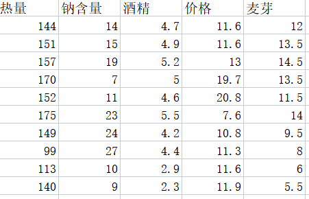 有10種500毫升啤酒的成分和價格等數(shù)據(jù),試用變量聚類對變量進(jìn)行聚類以達(dá)到縮減變量的目的,篩選出預(yù)測變量。數(shù)據(jù)的變量包括熱量、鈉含量、酒精含量、價格、麥芽濃度。