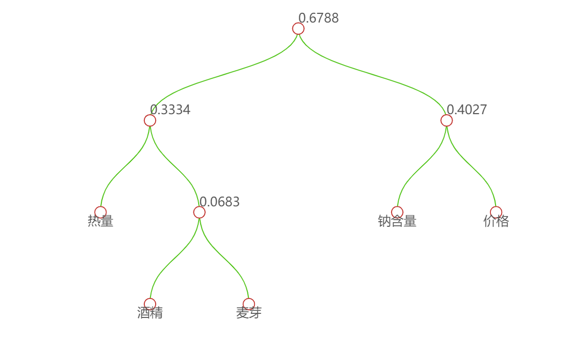 從結(jié)果樹狀圖中可以看出酒精含量與麥芽濃度兩個變量距離為0.0683,二者之間相關(guān)系數(shù)最大(相關(guān)系數(shù)等于1 - 距離)選其一即可,沒有必要都作為預(yù)測變量,導(dǎo)致成本增加。至于酒精含量和麥芽濃度選擇哪一個作為典型指標(biāo)來代替原來的兩個變量,可以根據(jù)專業(yè)知識或測定的難易程度決定。(與因子分析不同,是完全踢掉其中一個變量以達(dá)到降維的目的。)這里選用酒精含量,至此,確定出用于預(yù)測的變量為:酒精含量,鈉含量,熱量,價格。