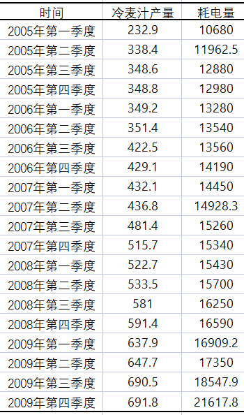 對(duì)于啤酒生產(chǎn)企業(yè),控制能源消耗是生產(chǎn)管理的重要部分。制冷耗電量是啤酒生產(chǎn)最大的能源消耗之一,占啤酒企業(yè)耗電量的43%左右。怎樣降低能源消耗, 加大成本控制力度是啤酒企業(yè)搞好生產(chǎn)管理的首要問(wèn)題。為此本案例將驗(yàn)證冷麥汁的產(chǎn)量和制冷耗電量是否存在因果關(guān)系。從而為減少能源消耗提供決策方向。