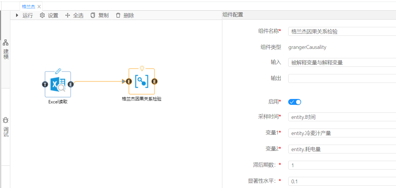 首先,從數(shù)據(jù)大腦中的組件面板搜索格蘭杰因果關(guān)系檢驗(yàn)組件,拖到到工作面板,配置數(shù)據(jù)及組件參數(shù):滯后期數(shù)選擇1,顯著性水平選擇0.1,點(diǎn)擊運(yùn)行。過(guò)程如圖1: