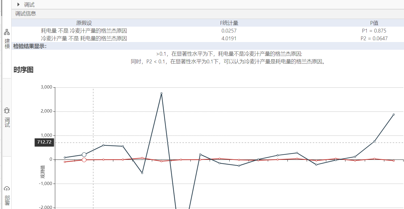 下表是某啤酒企業(yè)2005-2009年各個(gè)季度冷麥汁的產(chǎn)量和制冷耗電量的數(shù)據(jù),該時(shí)間序列數(shù)據(jù)經(jīng)過(guò)差分處理是平穩(wěn)的,符合格蘭杰因果檢驗(yàn)的前提。利用AIC信息準(zhǔn)則確定最優(yōu)階數(shù)是1,接下來(lái)將使用國(guó)工數(shù)據(jù)大腦已經(jīng)集成好的格蘭杰因果關(guān)系檢驗(yàn)算法對(duì)數(shù)據(jù)進(jìn)行雙向因果關(guān)系檢驗(yàn),即檢驗(yàn)冷麥汁的產(chǎn)量是否為制冷耗電量的格蘭杰原因及制冷耗電量是否為冷麥汁產(chǎn)量的格蘭杰原因。
