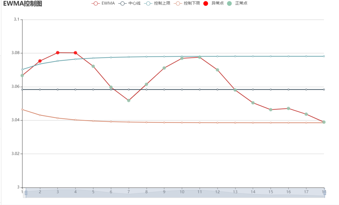 使用EWMA控制圖可以檢測過程均值的小偏移,因此該控制圖對個別高值或低值數據不敏感,比如生產過程中如果某個時間點的成本突然增高或者減少,則不會在控制圖中體現出來,因此如果想檢測單個數據的穩定情況,可以使用Xbar_R控制圖或者I_MR控制圖。