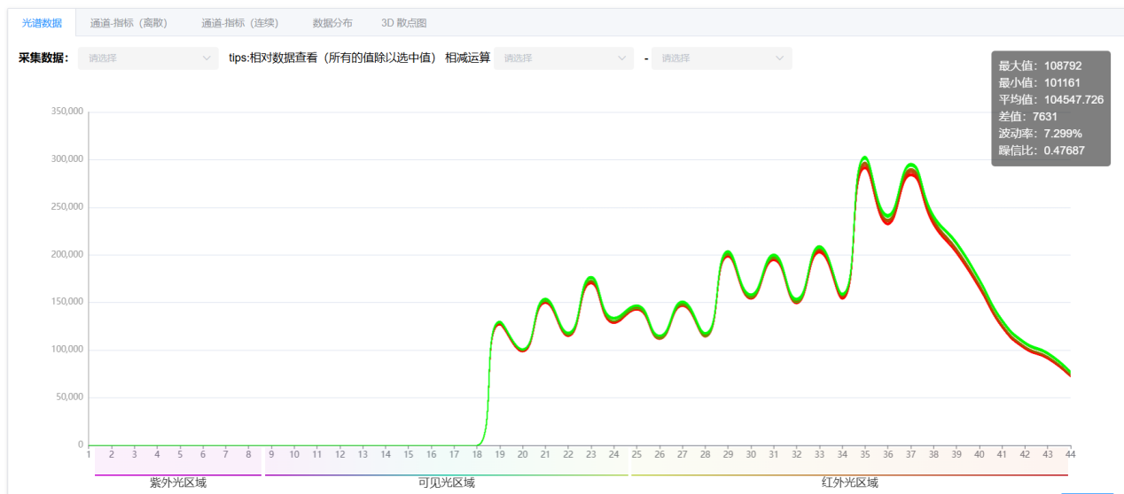 軟件系統通過對含水量錄入的標定值與光譜強度進行綜合分析,會得出噪信比圖以及相關性圖。其中噪信比圖表示每個波長通道上光譜數據噪聲與有效信息的比值,在實際應用中,此值越小越好。相關性圖表示所有樣品,在每個波長通道上吸收強度與指標標定值的線性或者非線性關系是否良好,直接反應出其檢測的可行性,在實際應用中,此值越大越好。